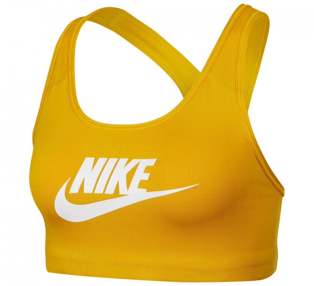 Универсальный топ-бра Classic Swoosh Futura от бренда Nike – это то, что нужно для современной девушки. Оптимальный уровень поддержки в сочетании с элегантным дизайном, делают такую модель незаменимым вариантом практически для любого спорта. Яркий желтки цвет модели поможет выделиться среди остальных спортсменов и подарит заряд положительных эмоций на всю тренировку. Женственный круглый вырез завершает образ. Фирменная технология материала Dri-FIT, позволяет эффективно бороться с лишней влагой, выводя ее на поверхность ткани, где она быстро испаряется. Вы сможете полностью сконцентрироваться на процессе тренировок и оставаться сухой. Компрессионная посадка помогает быстрее разогреть мышцы и не дает им быстро остывать. Мягкий и эластичный пояс под грудью обеспечивает дополнительную поддержку груди. Эластичная мягкая ткань приятно ощущается на теле, а плоские швы не доставляют дискомфорта во время физической активности и не натирают кожу. Классическая Т-образная спинка открывает плечи и позволяет надевать топ под майку борцовку. Топ-бра можно носить комплектом, как самостоятельный элемент гардероба, так и надевать в сочетании со спортивной майкой. По центру нанесен логотип бренда Nike, который завершает фирменный дизайн.Особенности и преимущества:
